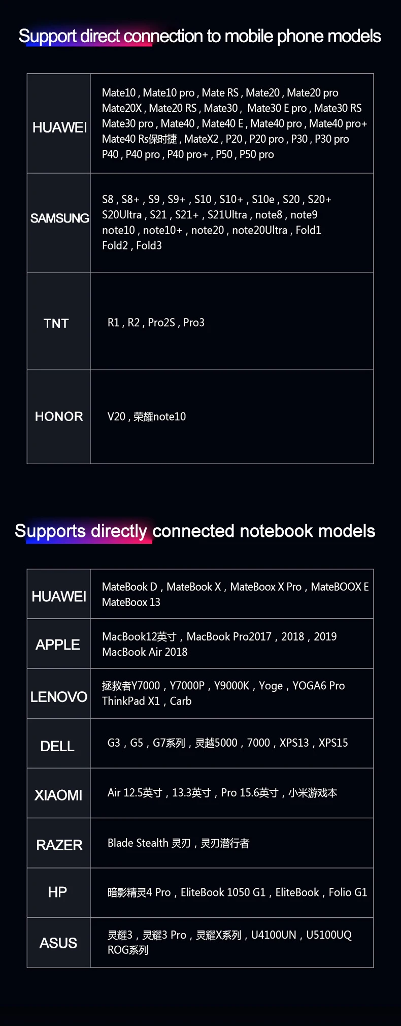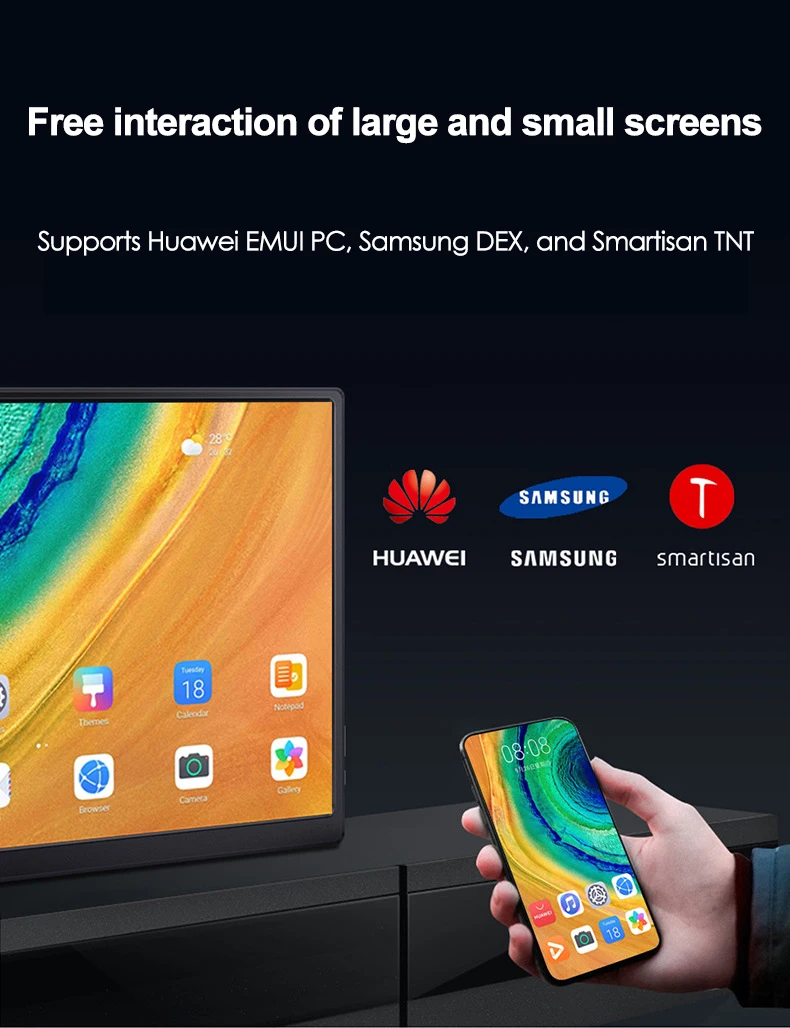 The mobile devices which support thunderbolt 3.0 (usb-c 3.1 gen2 protocol) can use a USB-C to USB-C data cable to achieve image output and power supply at the same time, and support signal transmission + power supply of two Type-C interfaces. Devices that cannot be connected by the Type C port can also get same functions and experience via HDMI and USB.