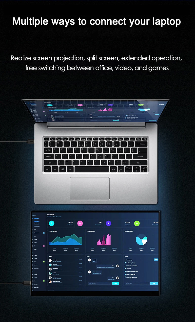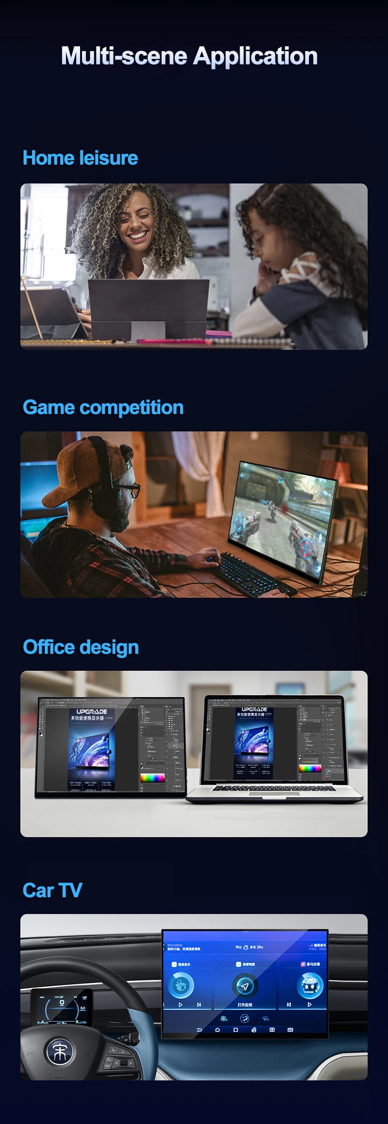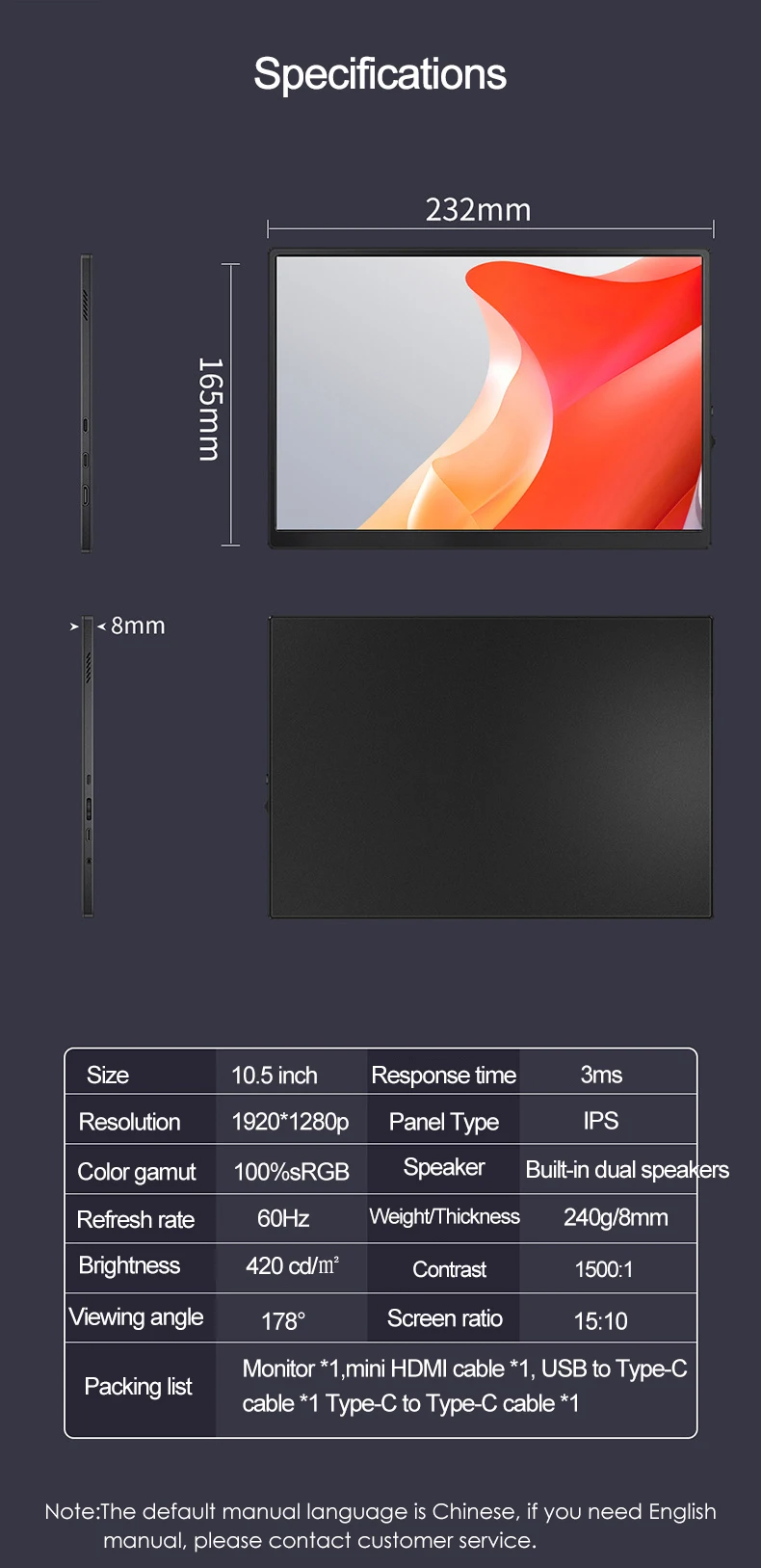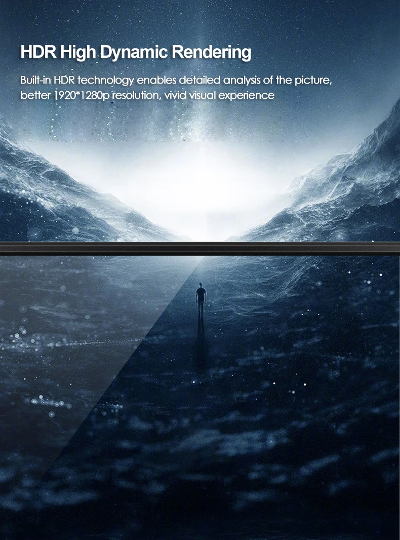 The portable monitor features Full HD 1920 x 1280 resolution and HDR support that provides a great gaming experience. Equipped with an IPS display to ensure accurate color restoration, exquisite image quality and richer colors. The 480 nits brightness, the contrast ratio 1500: 1, 100% sRGB and full viewing angle make it an ideal monitor for work or play games. Built-in dual speakers and 3.5mm headphone jack allow you to enjoy immersive audio-visual enjoyment.