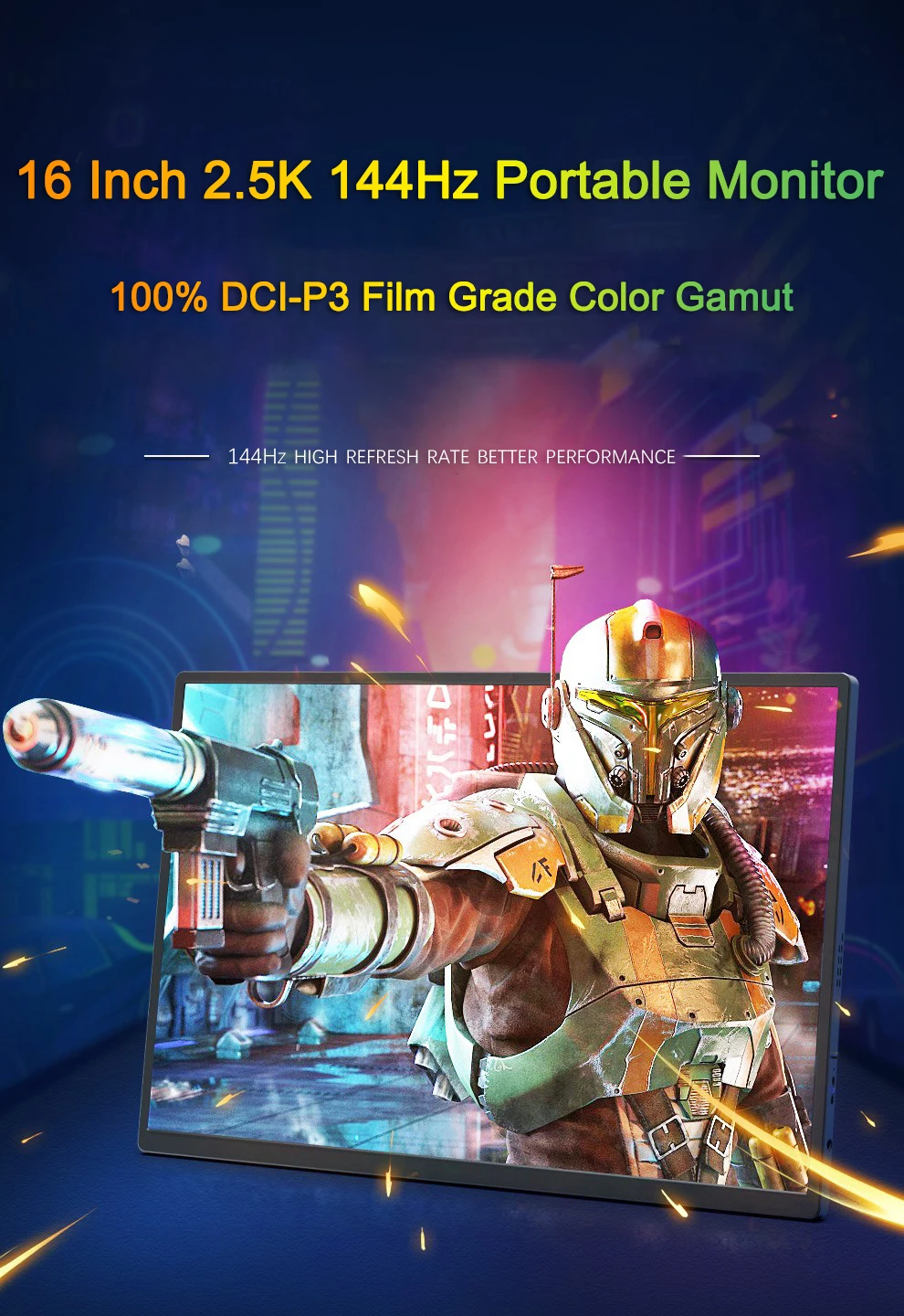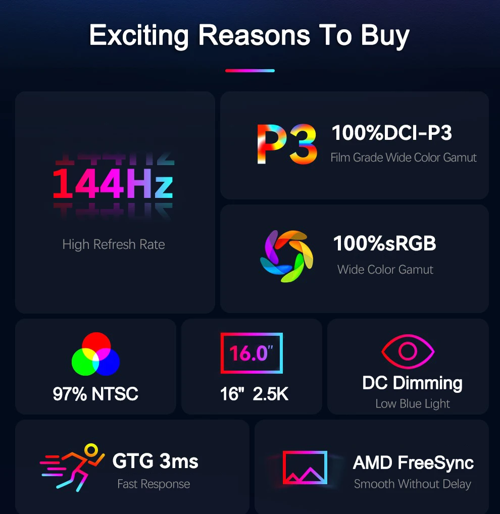16 Inch 2.5K 144Hz Portable Monitor 2560*1600 16:10 100%sRGB 480Cd/m² Display Game Screen For Laptop Mac Phone Xbox PS4/5 Switch