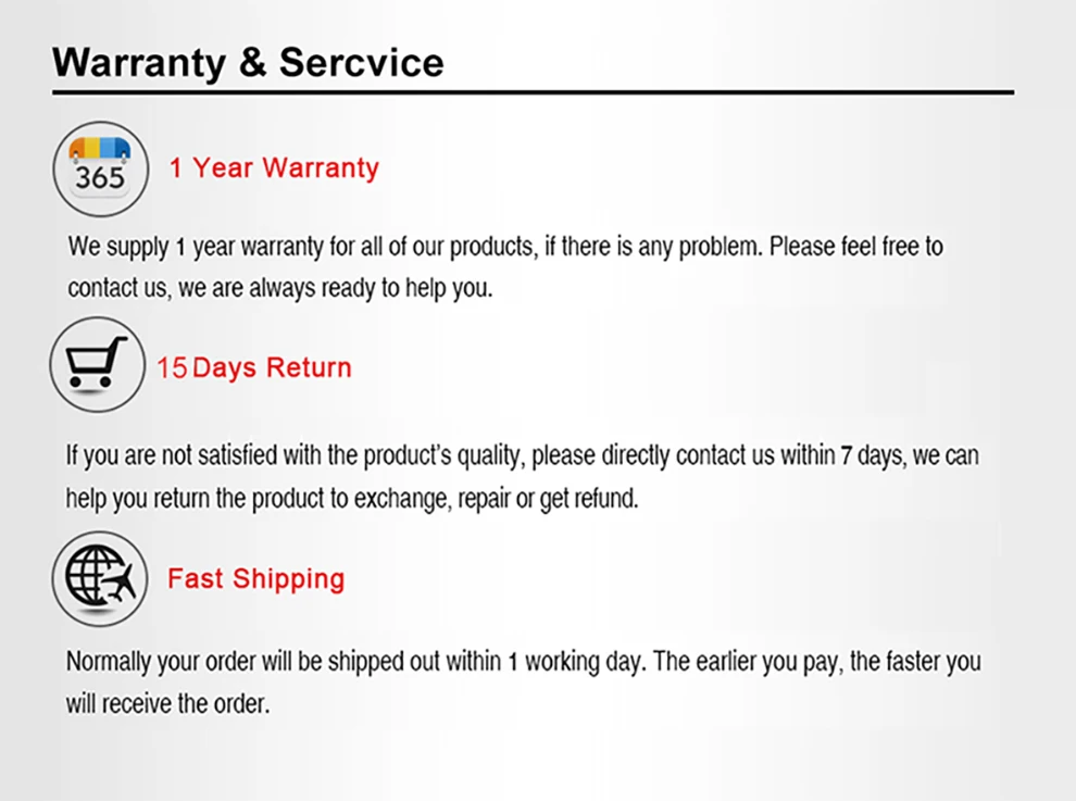 • If you did not receive the product within the guaranteed time( 45 days not including 2-5 day processing) you can request a refund or a reshipment.