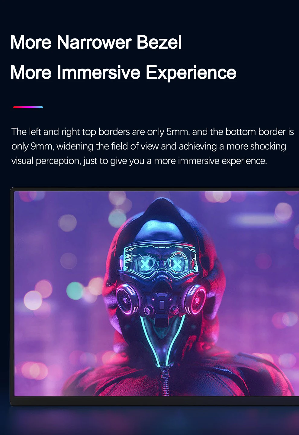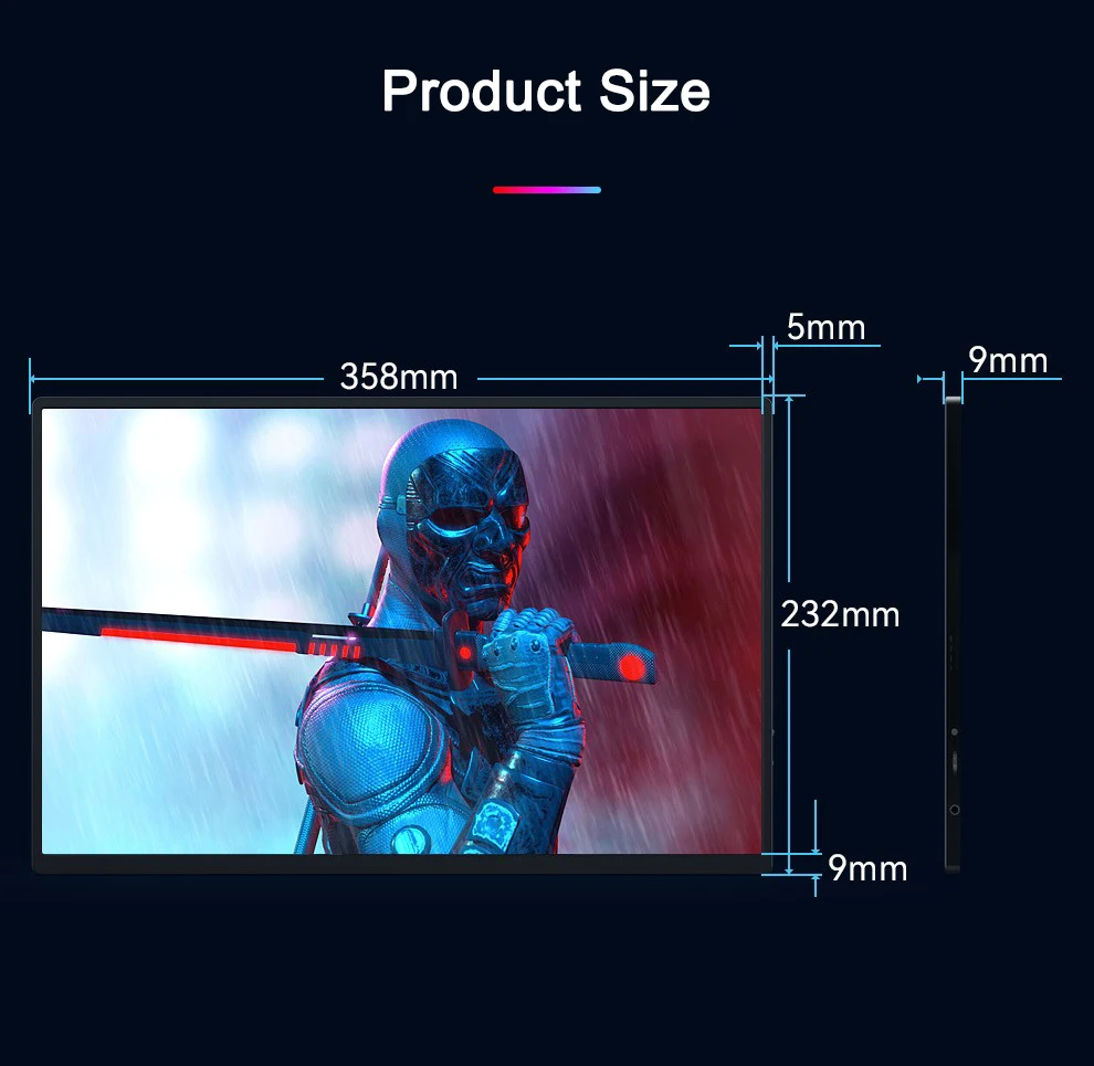【Ultra thin and light body】The thickness of the monitor is only 9mm and the weight is only 728g. With ultra-narrow bezels, the left and right and top bezels are only 5mm, and the bottom bezel is only 9mm, making it easy to carry and not tiring.