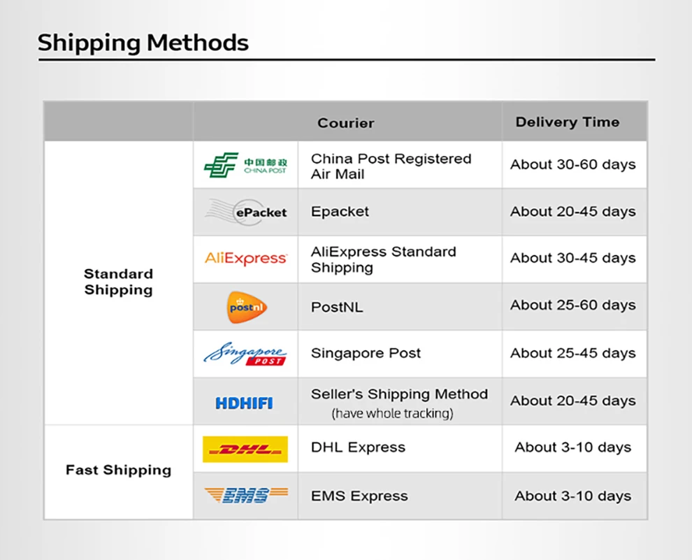 Packages from our warehouse in China will be shipped by ePacket or EMS depending on the weight and size of the product. Packages shipped from our US warehouse are shipped through USPS.