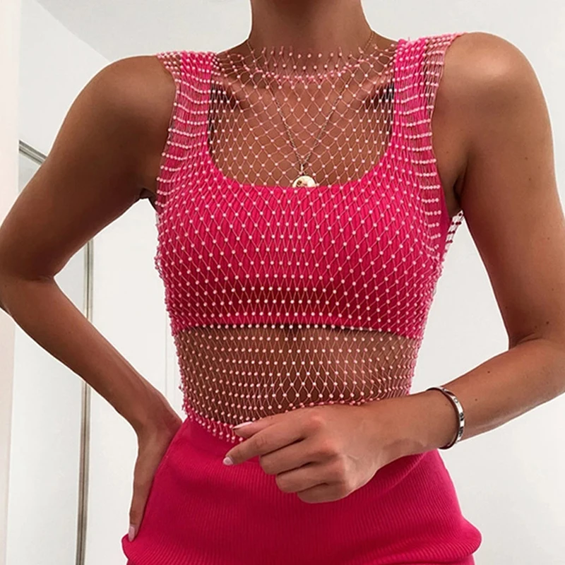 1PC Sexy Women Sleeveless Mesh Diamonds Fashion Crop Tops Summer Beach Party Skinny See Through Fishnet Tank Top Clubwear