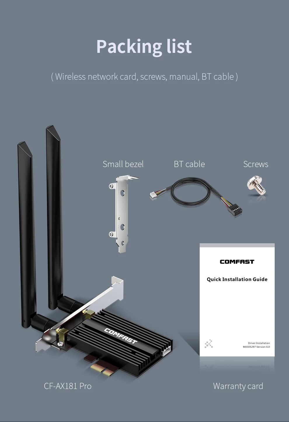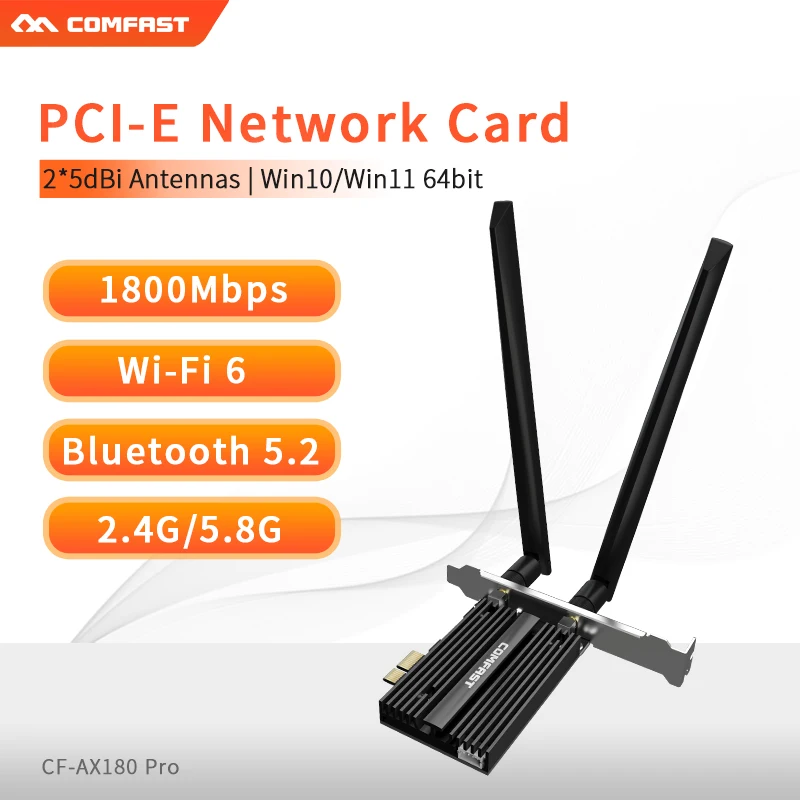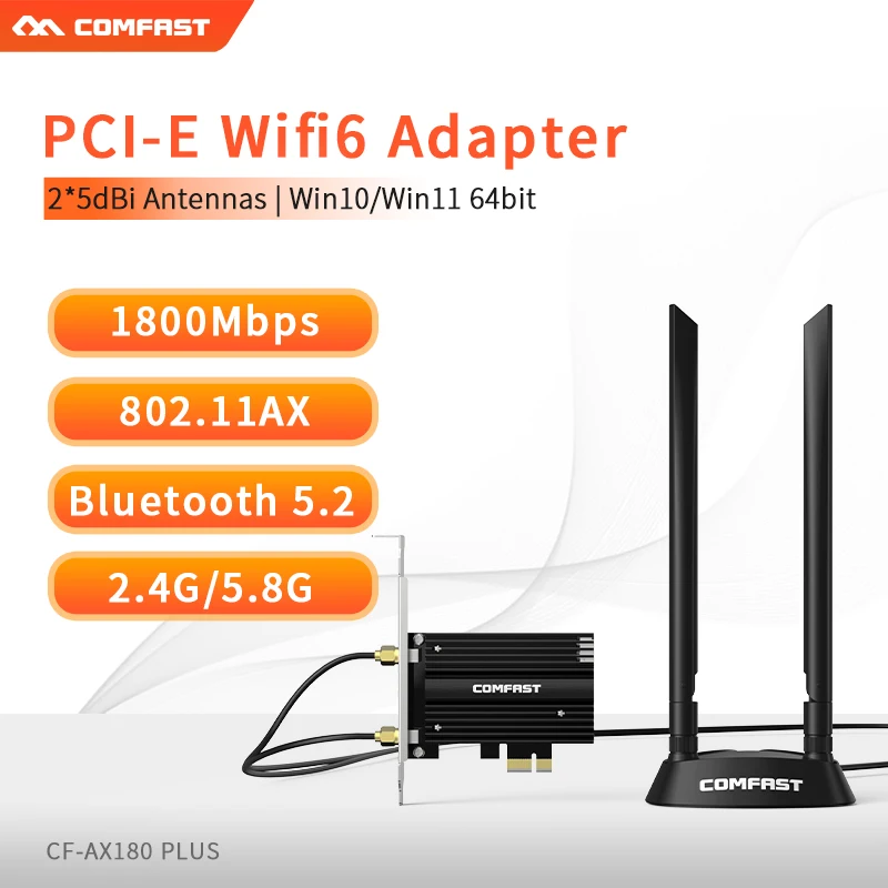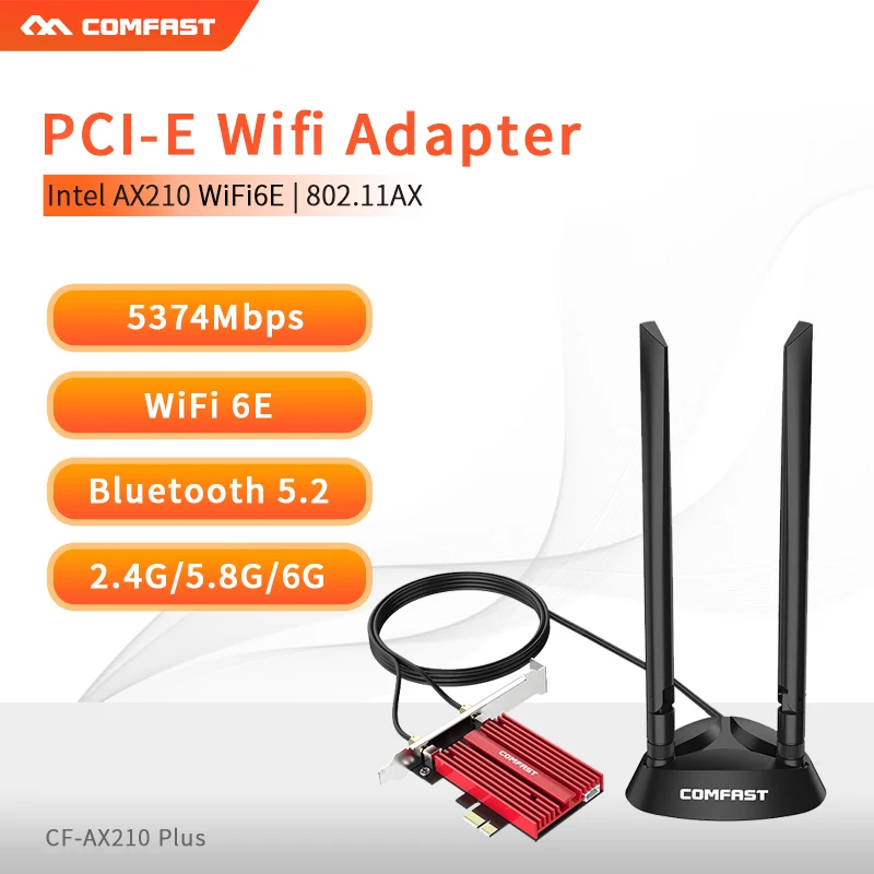 3000Mbps WiFi 6 PCIE Wireless WiFi Adapter Bluetooth 5.2 Intel AX210 Dual Band 2.4G/5Ghz PCI Express 802.11AX Wi-Fi Network Card Specification: 1.Brand: COMFAST 2.Model: CF-AX181 Pro PCI-E PC wifi adapter(See Details); 3.Chipest: Wifi 6E Card Chipset:AMD RZ608( MT7921K); 4.New Wi-Fi with Blutetooth 5.2; 5.Standard IEEE: 802.11ax/ac/a/b/g/n; Dual Band 2.4Ghz-600Mbps/5Ghz-1201Mbps/6Ghz-1201Mbps; 6.Note:…