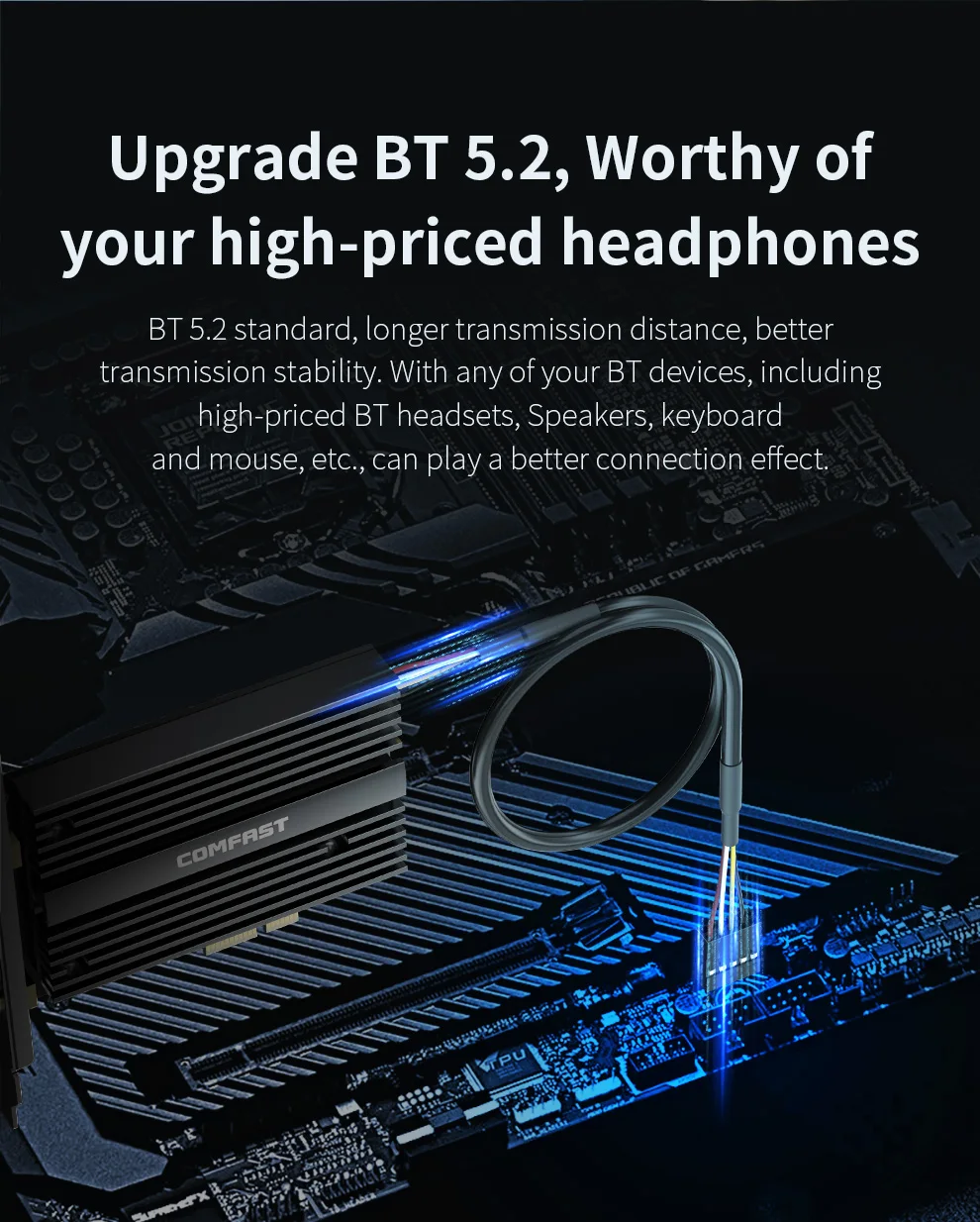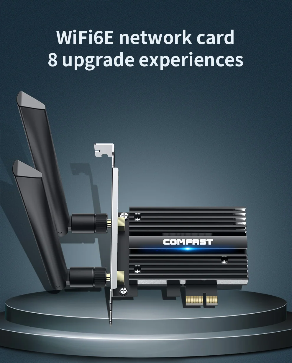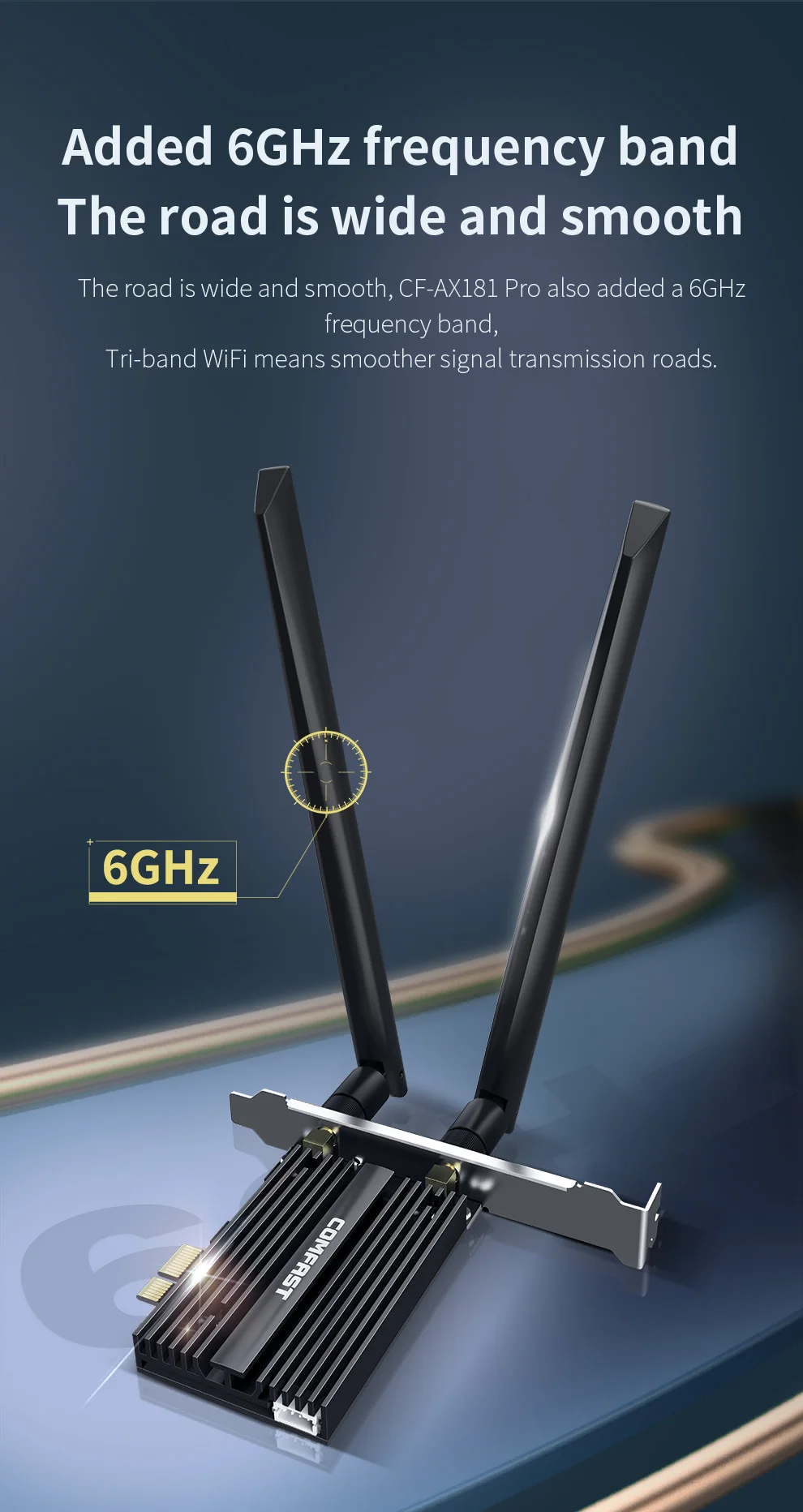 3000Mbps WiFi 6 PCIE Wireless WiFi Adapter Bluetooth 5.2 Intel AX210 Dual Band 2.4G/5Ghz PCI Express 802.11AX Wi-Fi Network Card Specification: 1.Brand: COMFAST 2.Model: CF-AX181 Pro PCI-E PC wifi adapter(See Details); 3.Chipest: Wifi 6E Card Chipset:AMD RZ608( MT7921K); 4.New Wi-Fi with Blutetooth 5.2; 5.Standard IEEE: 802.11ax/ac/a/b/g/n; Dual Band 2.4Ghz-600Mbps/5Ghz-1201Mbps/6Ghz-1201Mbps; 6.Note:…