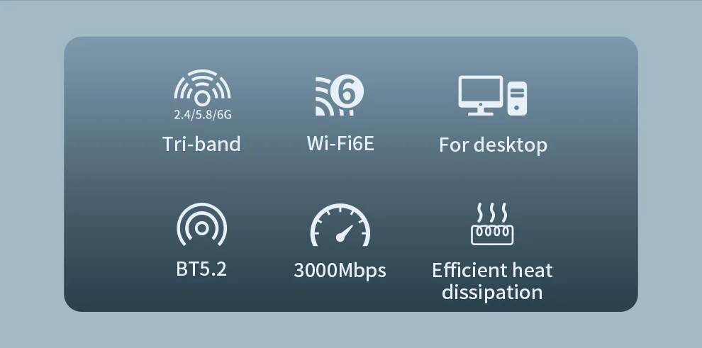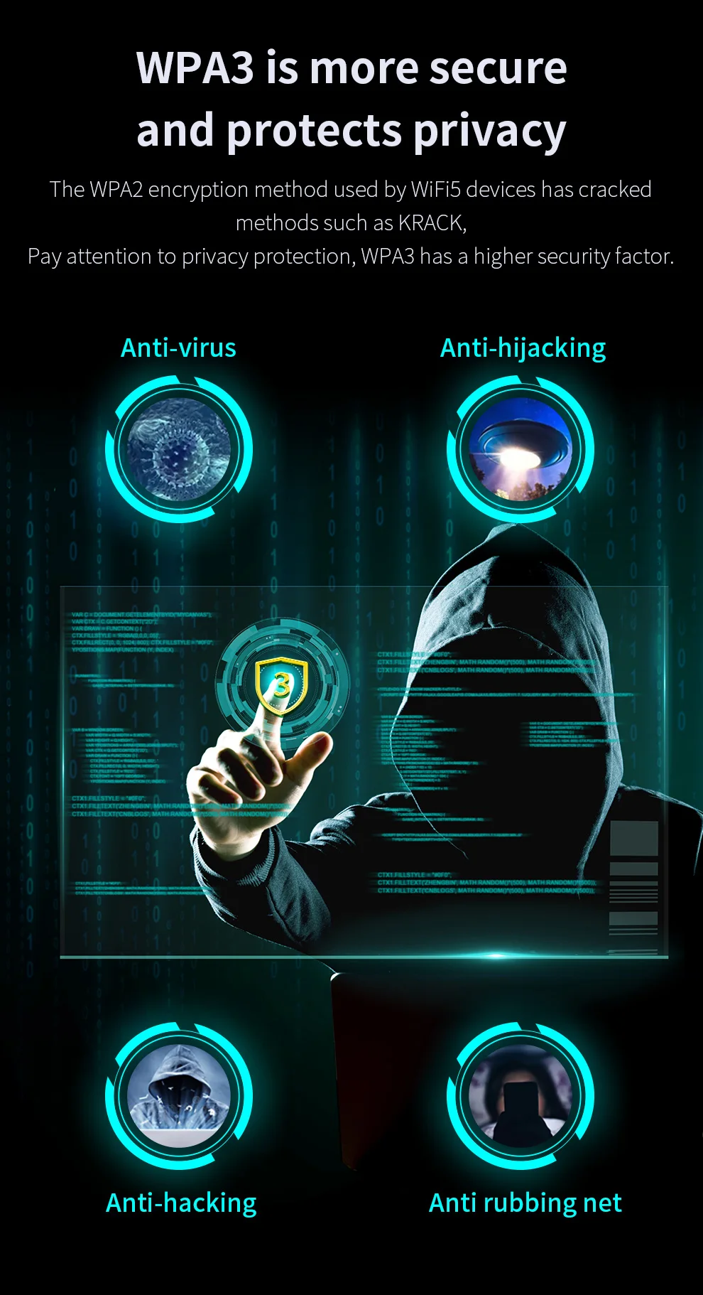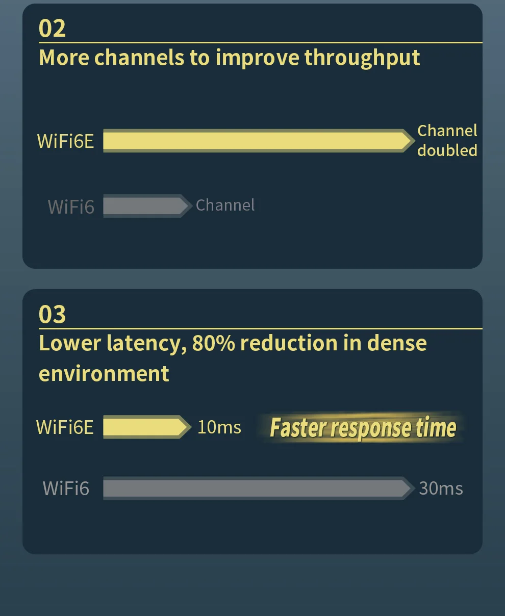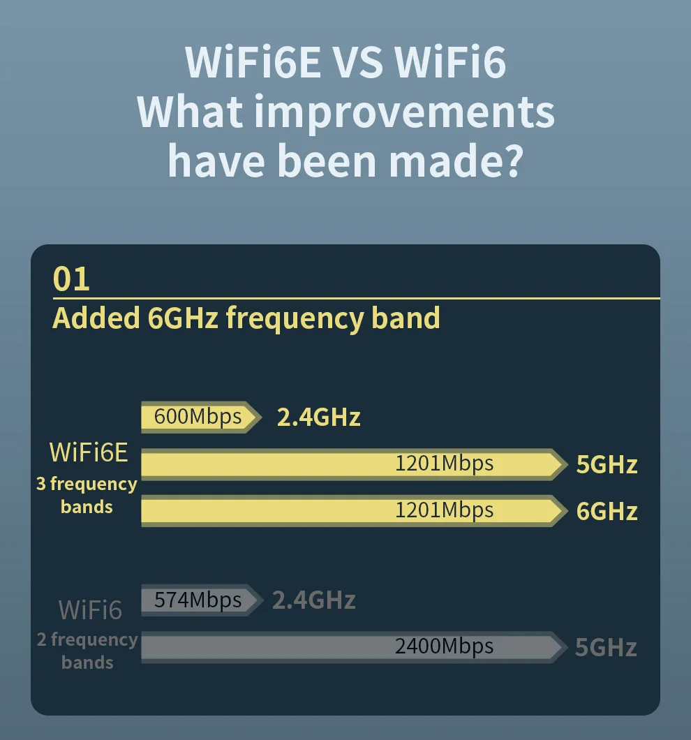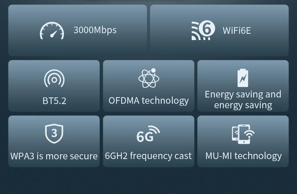 5.Standard IEEE: 802.11ax/ac/a/b/g/n; Dual Band 2.4Ghz-600Mbps/5Ghz-1201Mbps/6Ghz-1201Mbps;