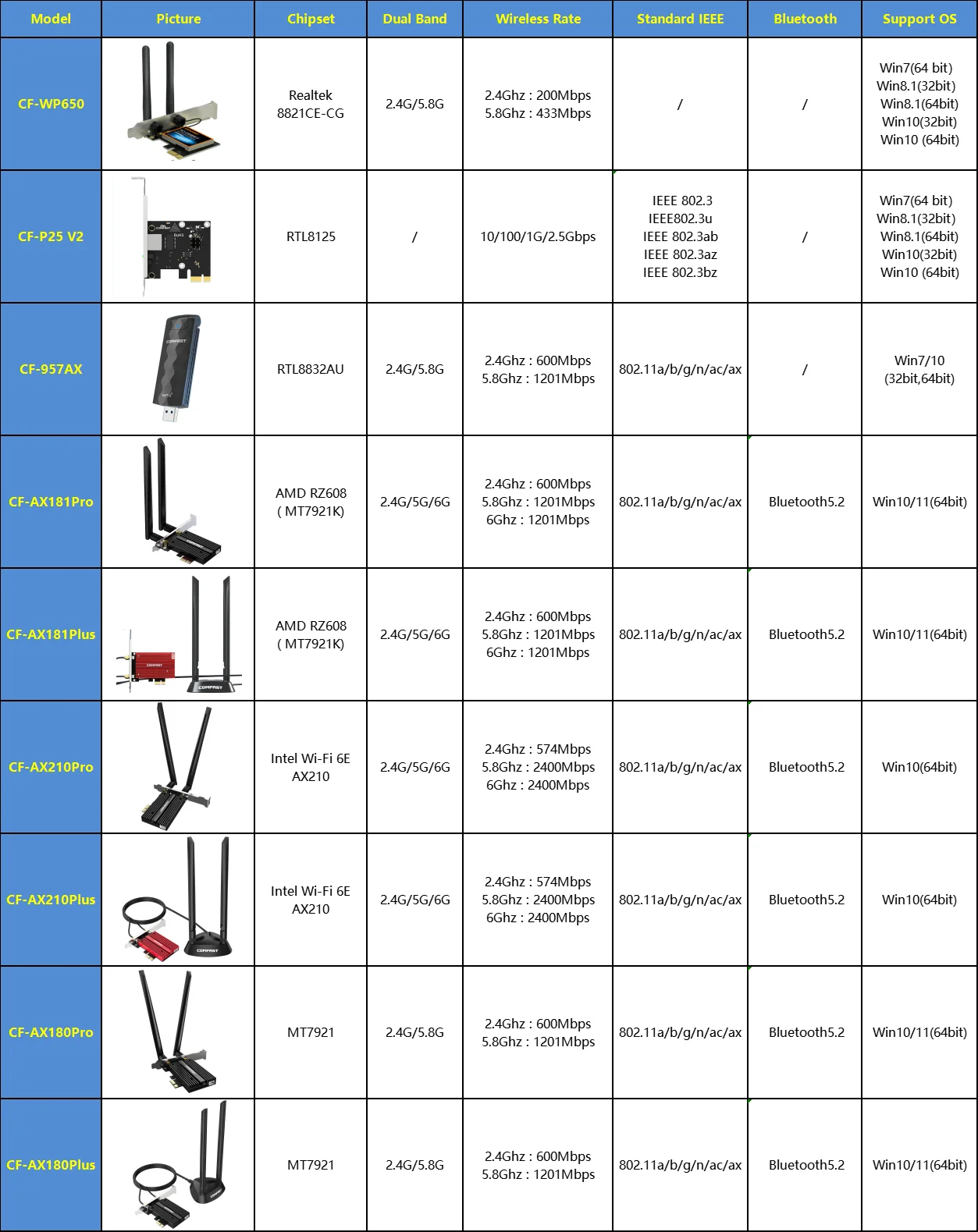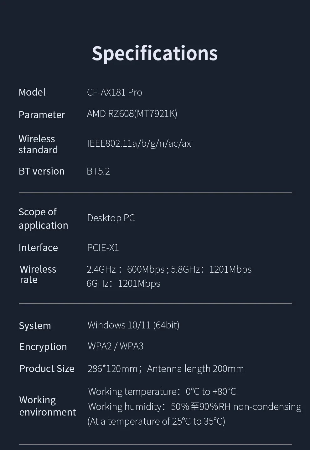 2.Model: CF-AX181 Pro PCI-E PC wifi adapter(See Details);