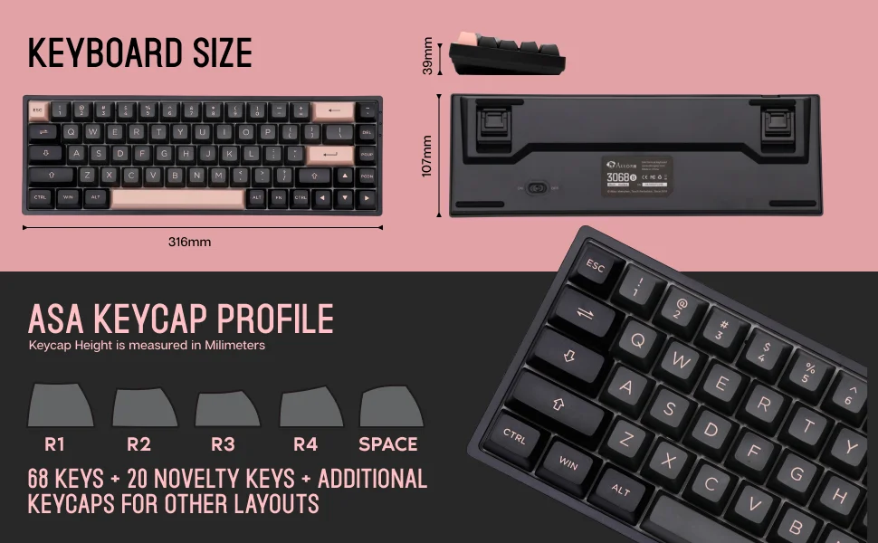 • 1800 mAh Battery; Programmable with Double Shot PBT ASA Profile Keycaps;
