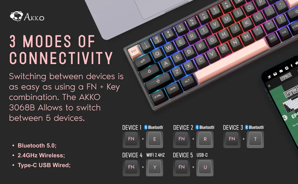 • With the updated Akko Beken Plus multi-modes solution with BT5.0/2.4Ghz/Type-C All-in-One;