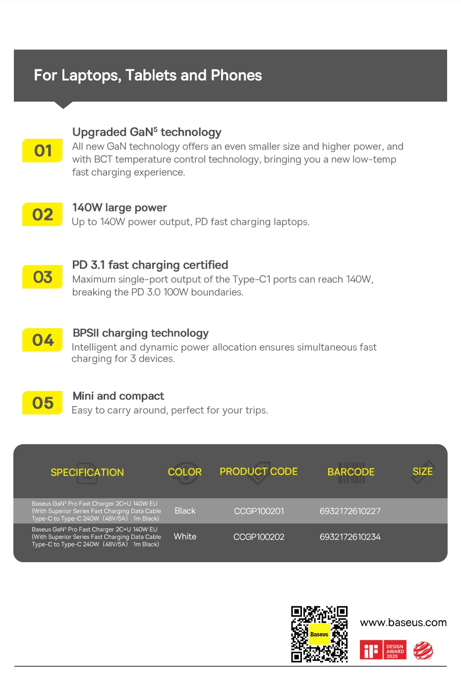 Baseus 140W Multi Ports GaN5 Pro Fast Charger