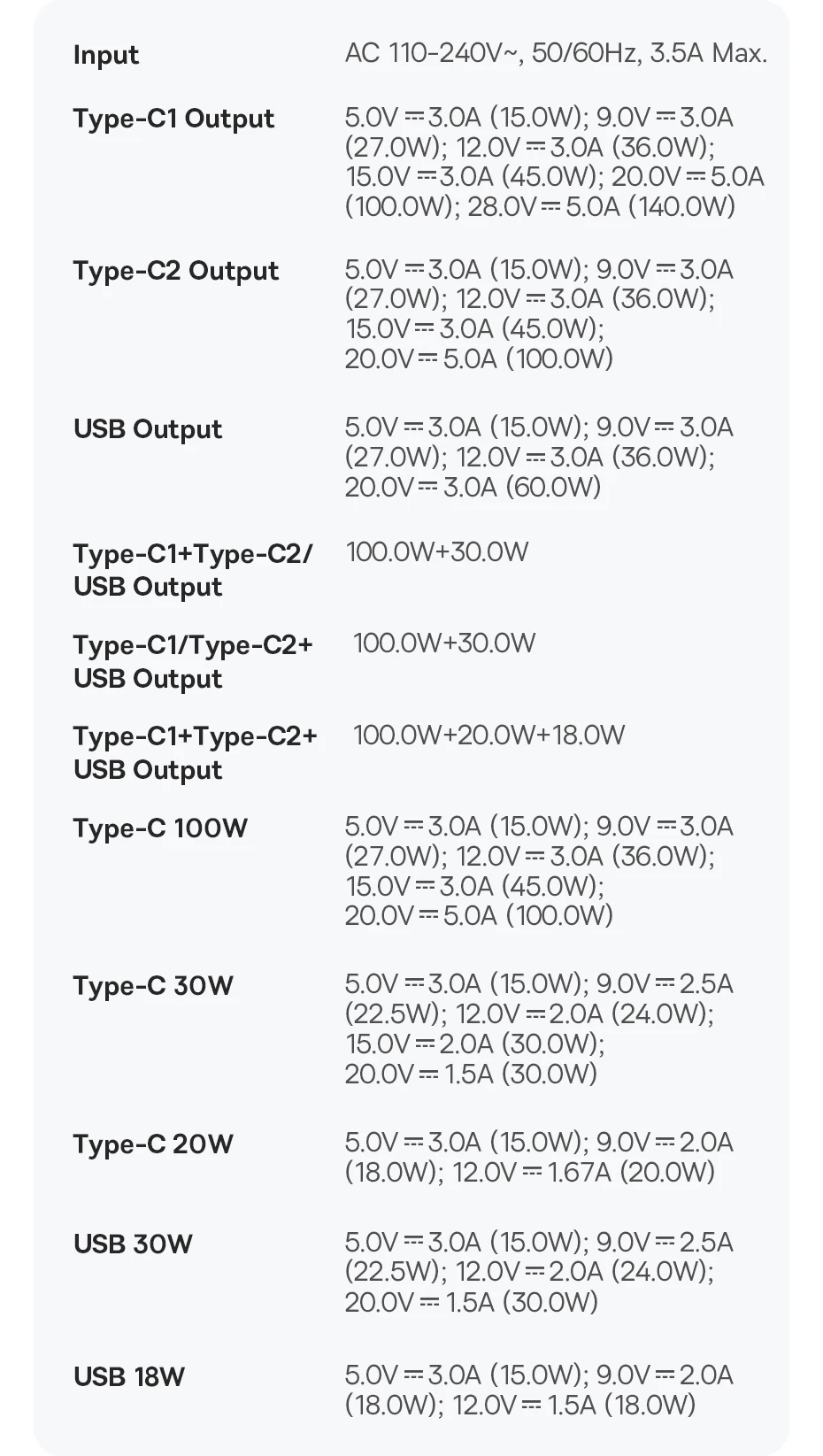 Type-C 1 Output: 5V/3A (15W); 9V/3A (27W); 12V/3A (36W); 15V/3A (45W); 20V/5A (100W); 28V/5A (140W)