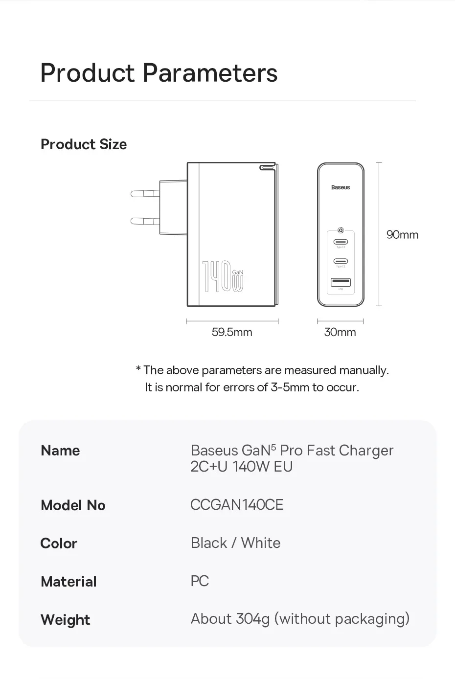 Baseus 140W Multi Ports GaN5 Pro Fast Charger ✅Input:  AC 110-240V-, 50/60Hz, 3.5A Max. ✅Output Type-C 1 Output: 5V/3A (15W); 9V/3A (27W); 12V/3A (36W); 15V/3A (45W); 20V/5A (100W); 28V/5A (140W) Type-C 2 Output:  5V/3A (15W); 9V/3A (27W); 12V/3A (36W); 15V/3A (45W); 20V/5A (100W)USB Output: 5V/3A (15W); 9V/3A (27W); 12V/3A (36W);…