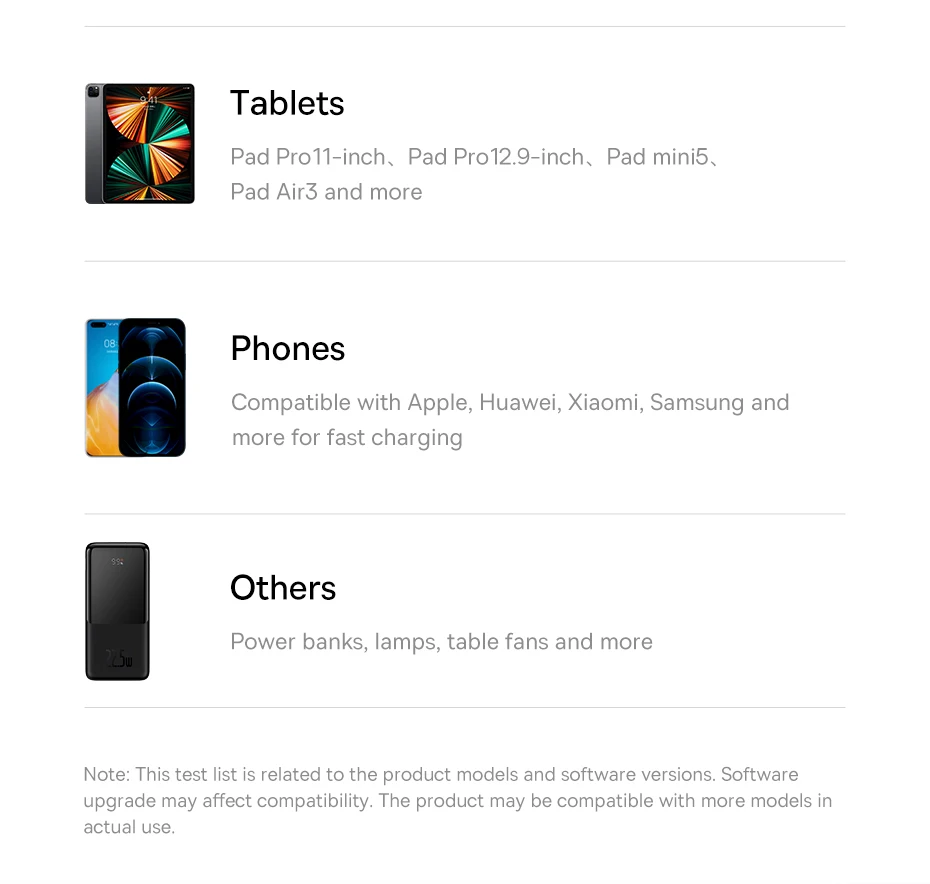 USB Output: 5V/3A (15W); 9V/3A (27W); 12V/3A (36W); 20V/3A (60W)