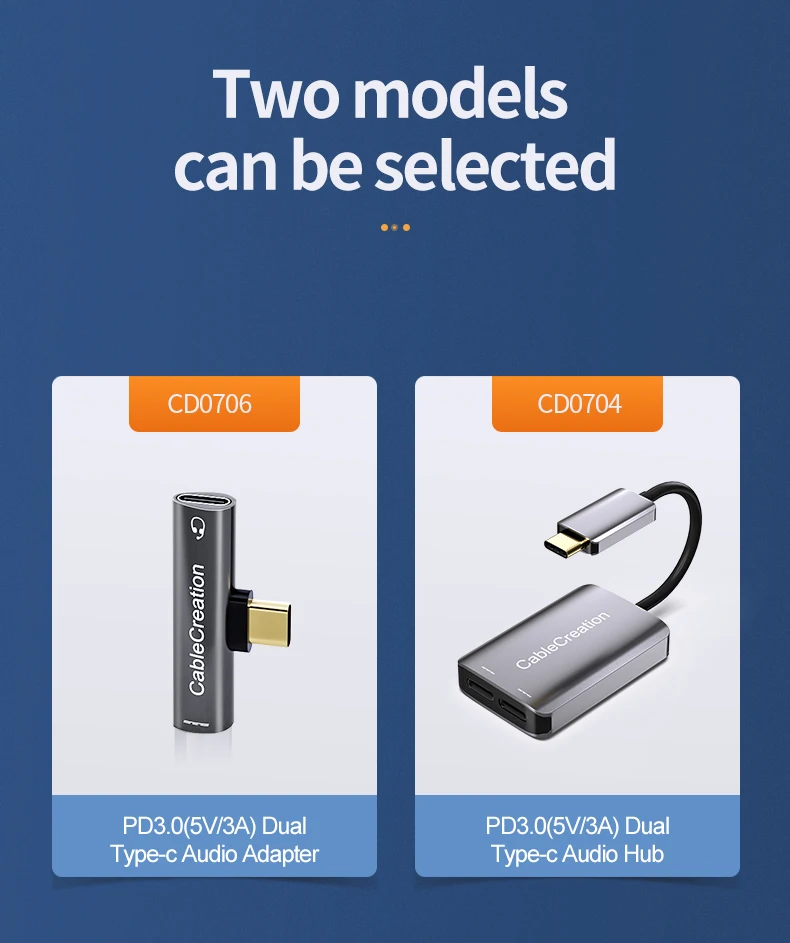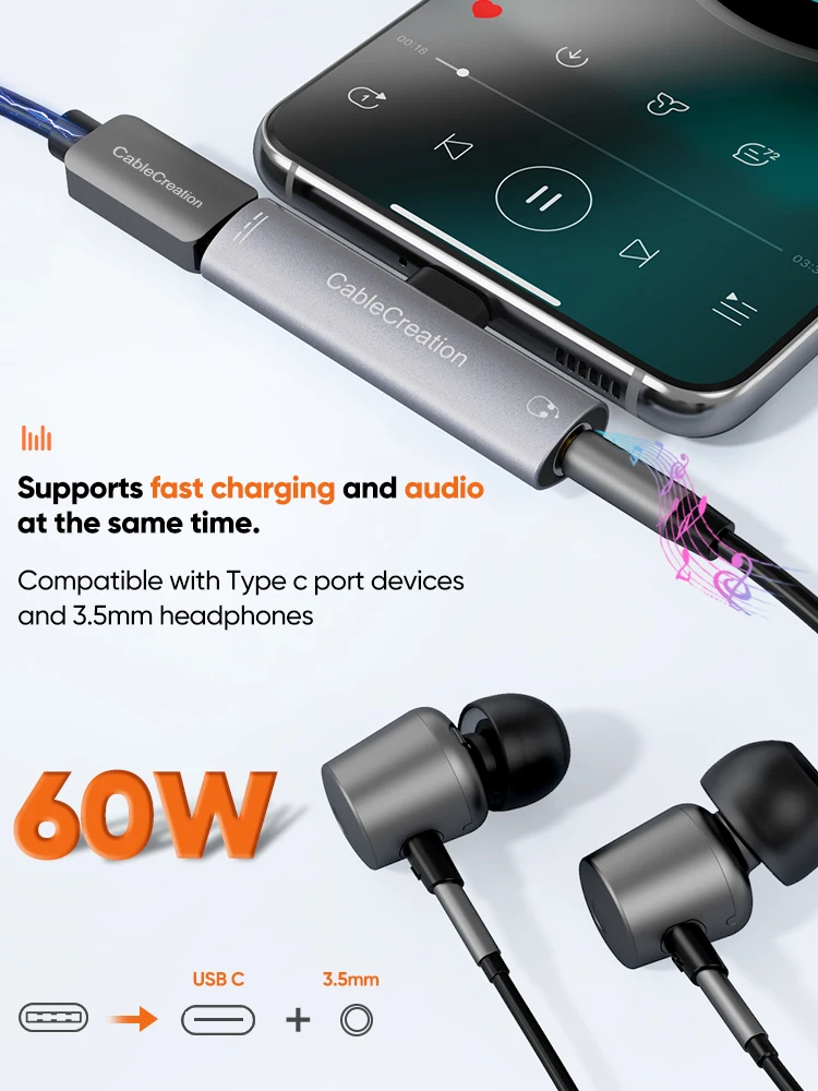 CableCreation 2-in-1 USB-C Headphone Jack Adapter CD0700 Type c to 3.5mm AUX +PD 60W Adapter The USB C to 3.5mm audio adapter features a built-in smart chipset to Support volume control and answer calls on compatible devices. CD0706 Dual Type C Splitter Audio+PD Charging Q1: Is this audio adapter compatible…
