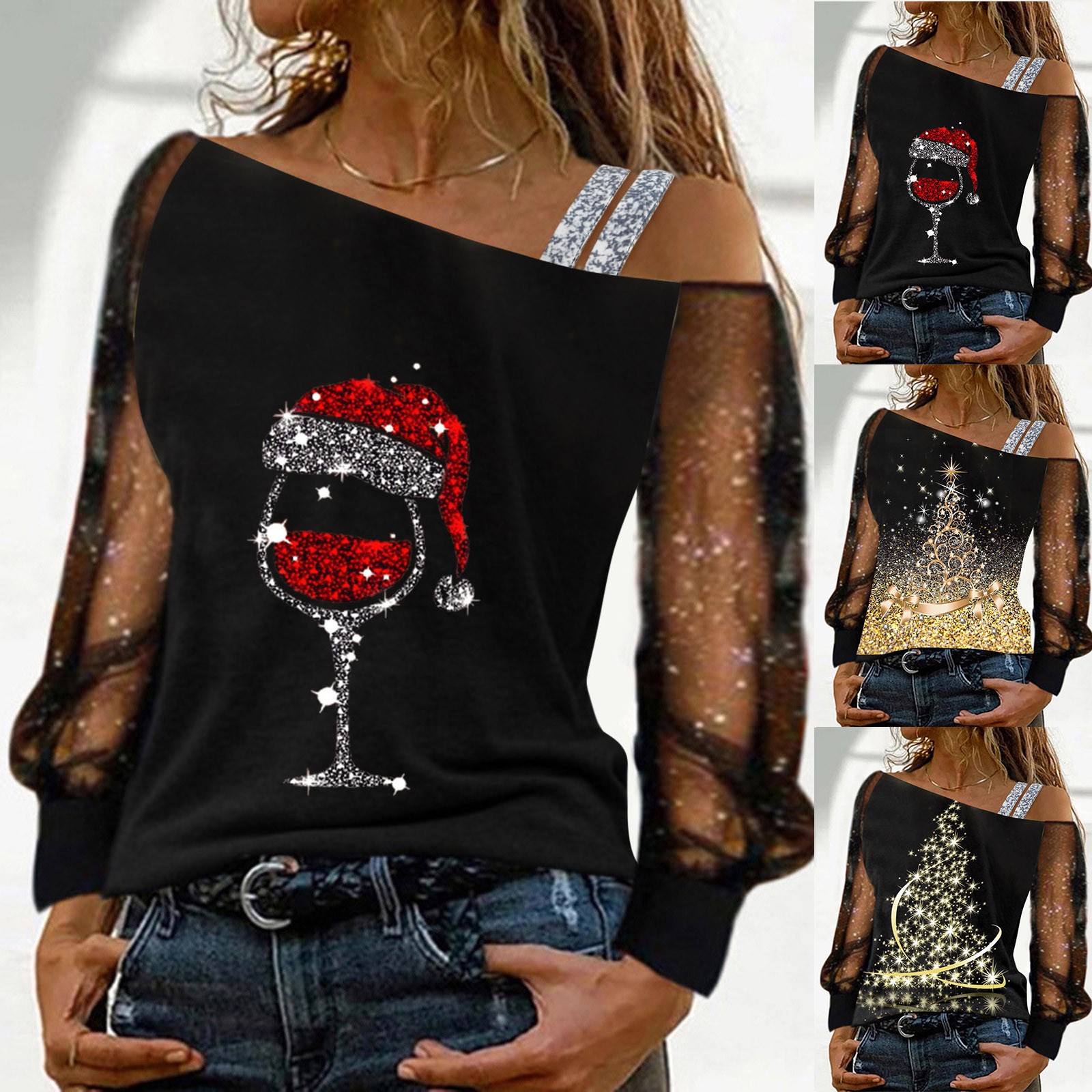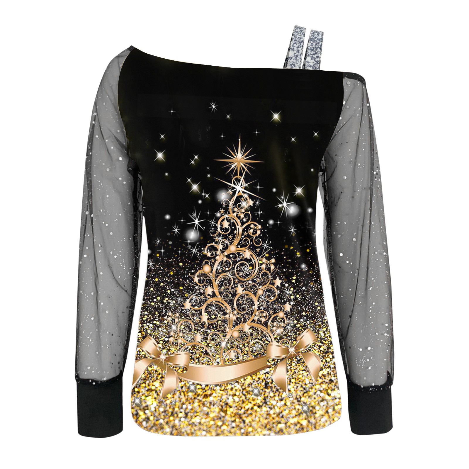 Women’s Casual Loose Sleeve Sequin Blouse Print Mesh T Shirt Splice Long Women Tops Long Sleeve T Shirt