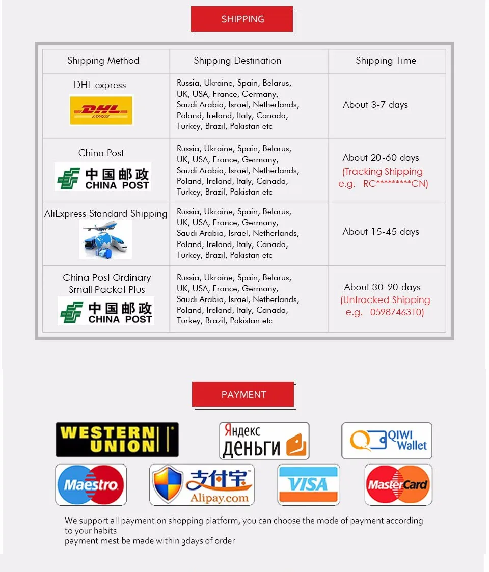 Packages from our warehouse in China will be shipped by ePacket or EMS depending on the weight and size of the product. Packages shipped from our US warehouse are shipped through USPS.