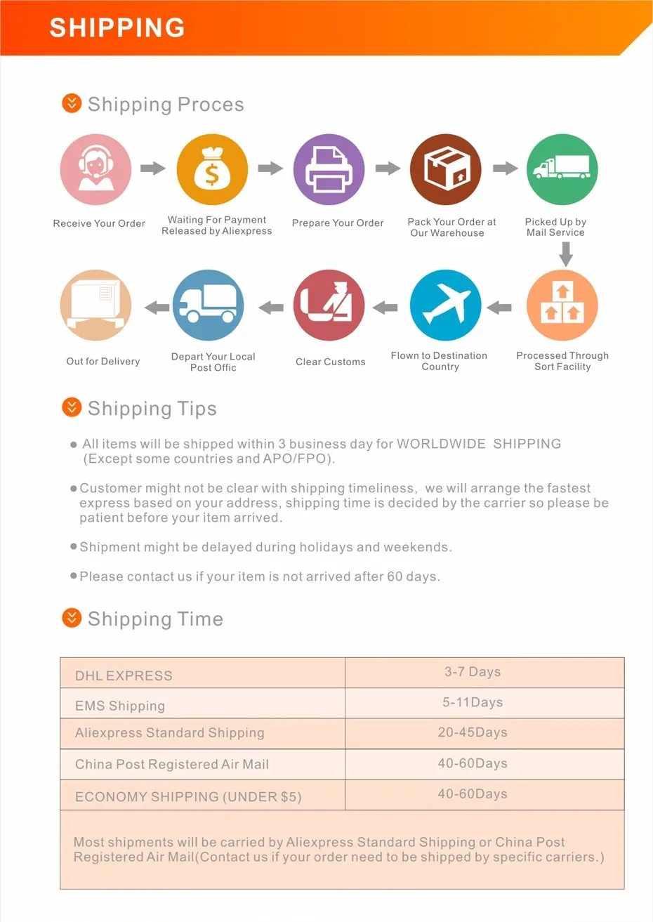 Packages from our warehouse in China will be shipped by ePacket or EMS depending on the weight and size of the product. Packages shipped from our US warehouse are shipped through USPS.