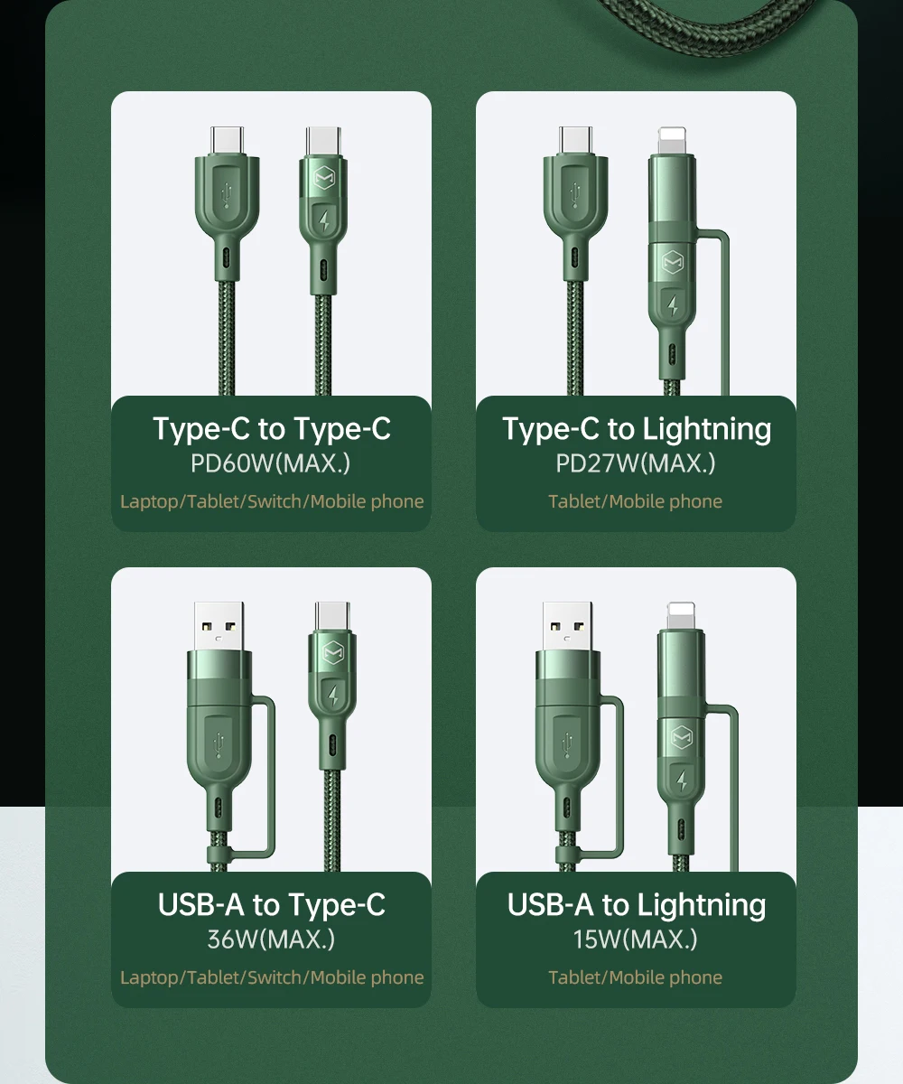 Mcdodo USB Type C 4 in 1 Fast Charge Cable PD 60W Data Wire For iPhone 13 12 11 IPad Xiaomi Samsung Huawei 3A Phone Charger Cord