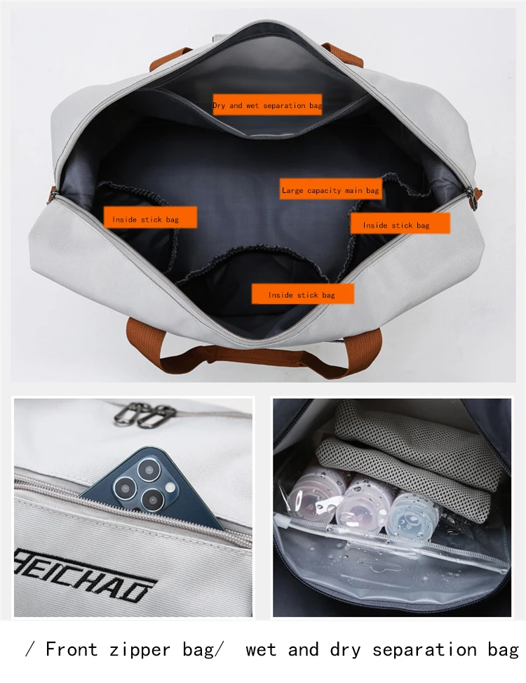 Size of the bag :Length 46cm X Width 25cm X Height 28cm. There are 7 pockets in total: 1 Dry and wet separation bag: height 18cm, width 29cm. 1 Large capacity main bag: height 28cm, width 46cm. 1 Inner sticking bag: height 16cm, width 22cm. 1 Inner sticking bag: height…