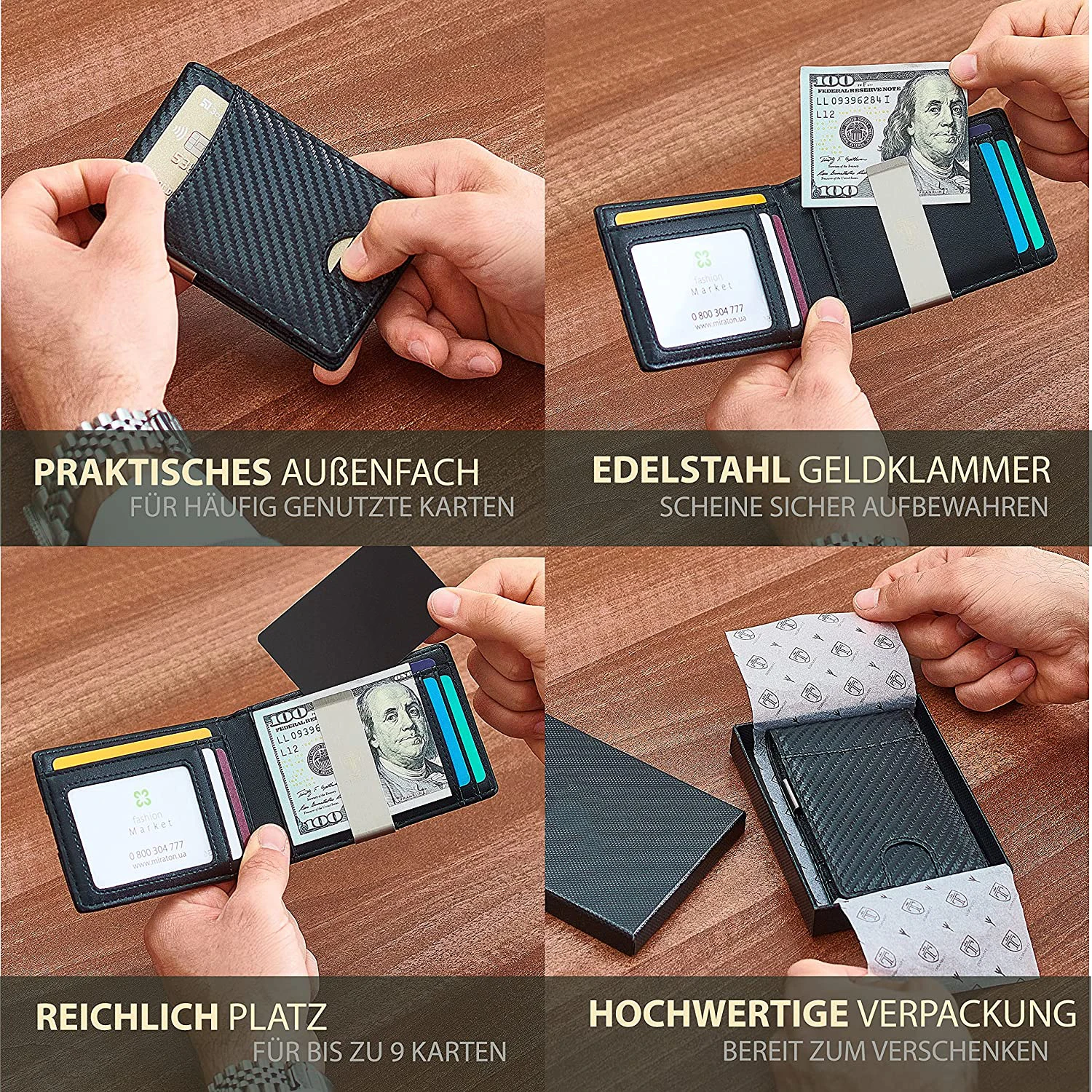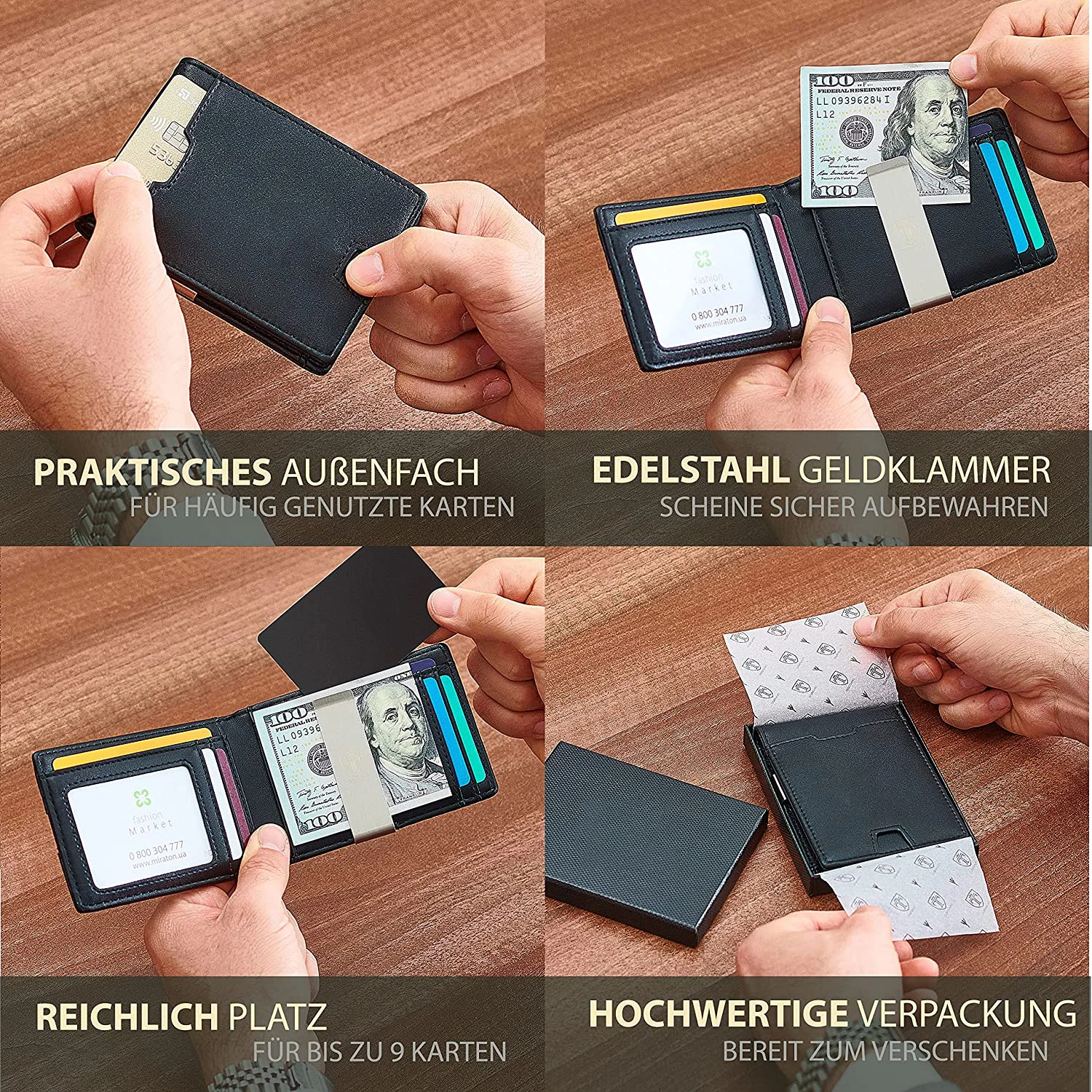 Size: 11*7.8*1.5cm(4.33*3*0.6inch).Thanks to the intelligent division of the card slots and money clips, the wallet offers enough space for everything you need and still remains compact so that your pocket does not bulge.