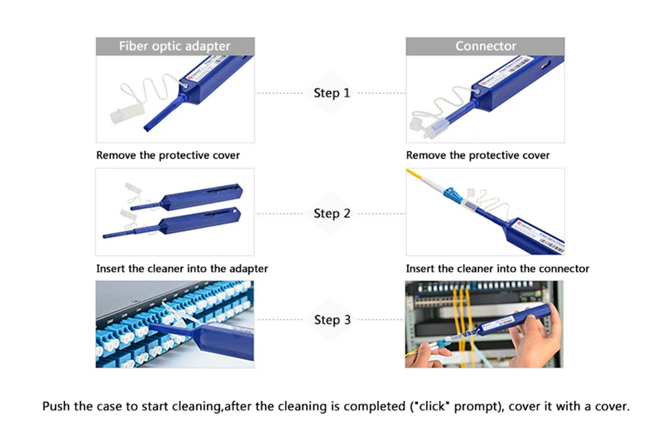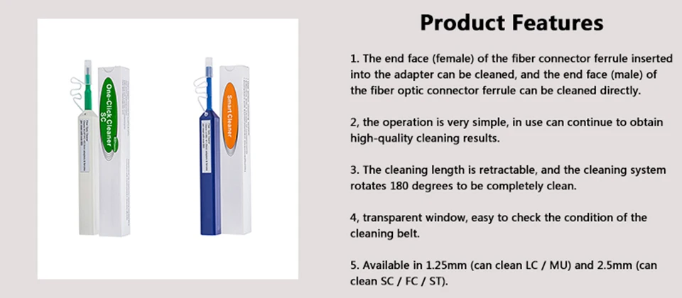 Use a dry cleaning cloth to replace the solvent requirements. One-touch design, one push, one second cleaning, can clean more than 800 times 1.25mm LC / MU fiber connector and 2.5mm SC / FC / ST fiber connector.