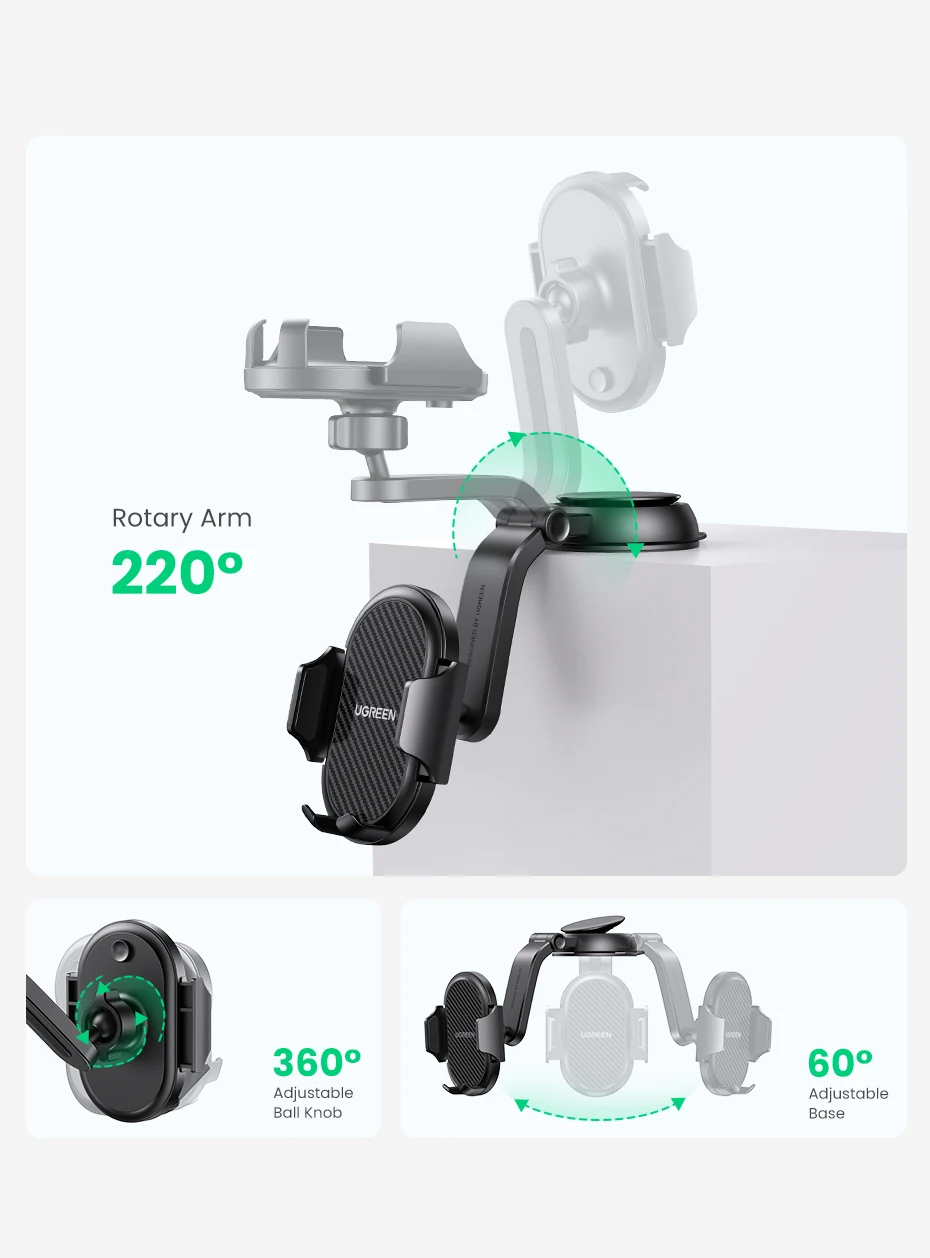 Long arm of this car phone holder can be easily adjusted to Max 220-degree without blocking your view while driving.