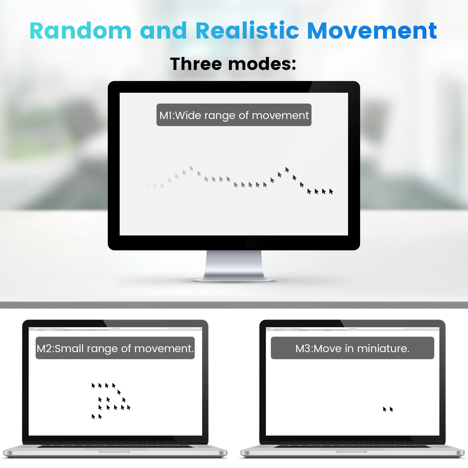 • 【Multi-track&Memory Function】Our USB mouse mover can realize 3 tracks optional by it's exclusive mode button, the cursor will automatically move randomly in different trajectory and amplitudes according to your choice. In addition, this mini mouse movement simulator is designed with memory function, the next time it is turned on, it will continue to move according to the previous trajectory.