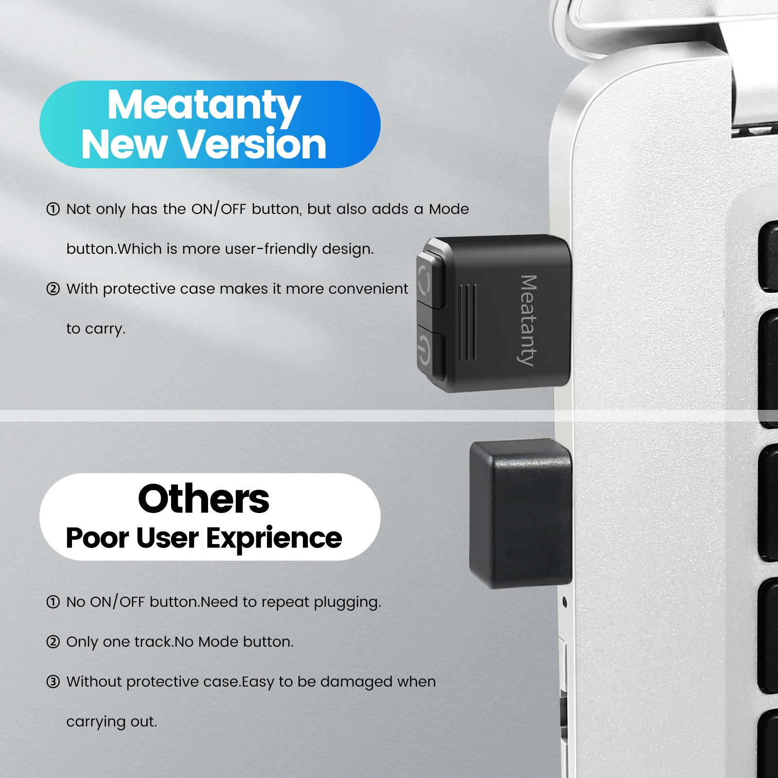 【ON/OFF & Mode Selection Buttons】Compared to most usb mouse jigglers on the market, Meatanty mouse jiggler combines “ON/OFF switch” and “Mode selection” 2 buttons on one device which makes it easier to operate and greatly enriches user experience,and avoiding repeatedly plugging and unplugging the mouse mover, that's really saves your USB ports from damage.