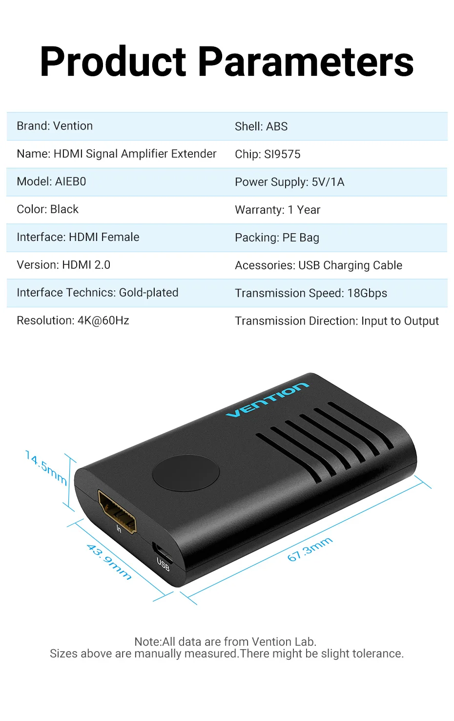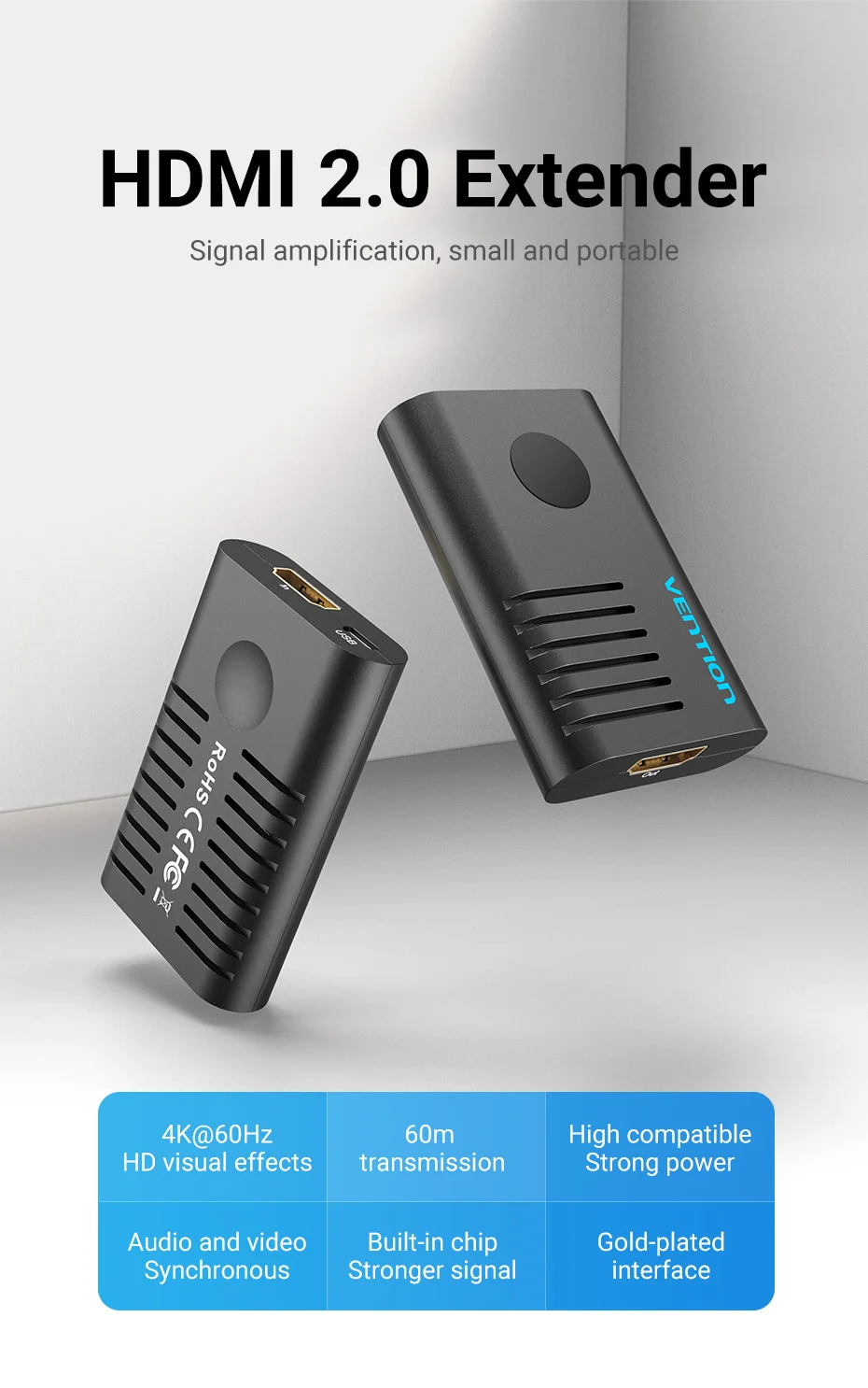 Vention HDMI Extender HDMI 2.0 Female to Female Repeater up to 10m 60m Signal Booster Active 4K@60Hz HDMI to HDMI Extension