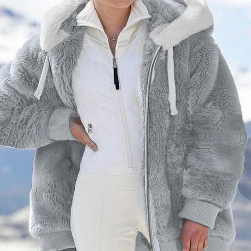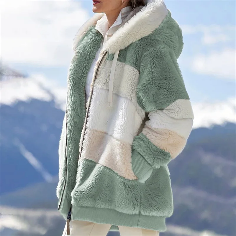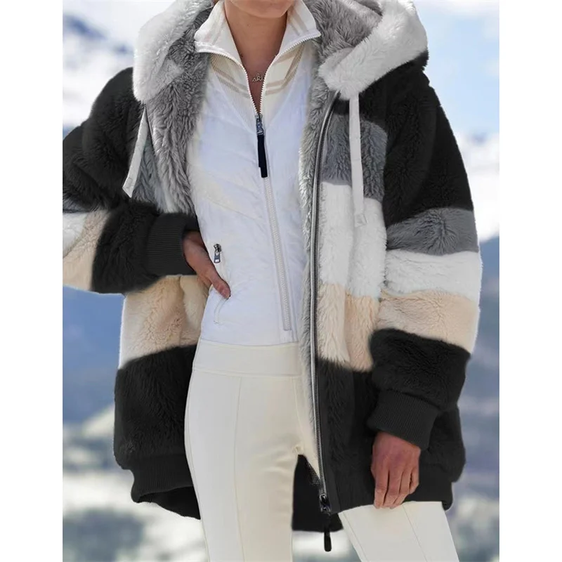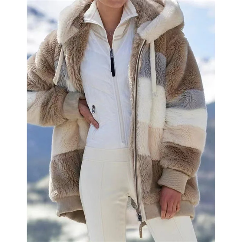 Winter Women Jacket New Warm Plush Patchwork Zipper Pocket Stitching Hooded Plaid Faux Fur Retro Long Sleeve Top Coat Outwear