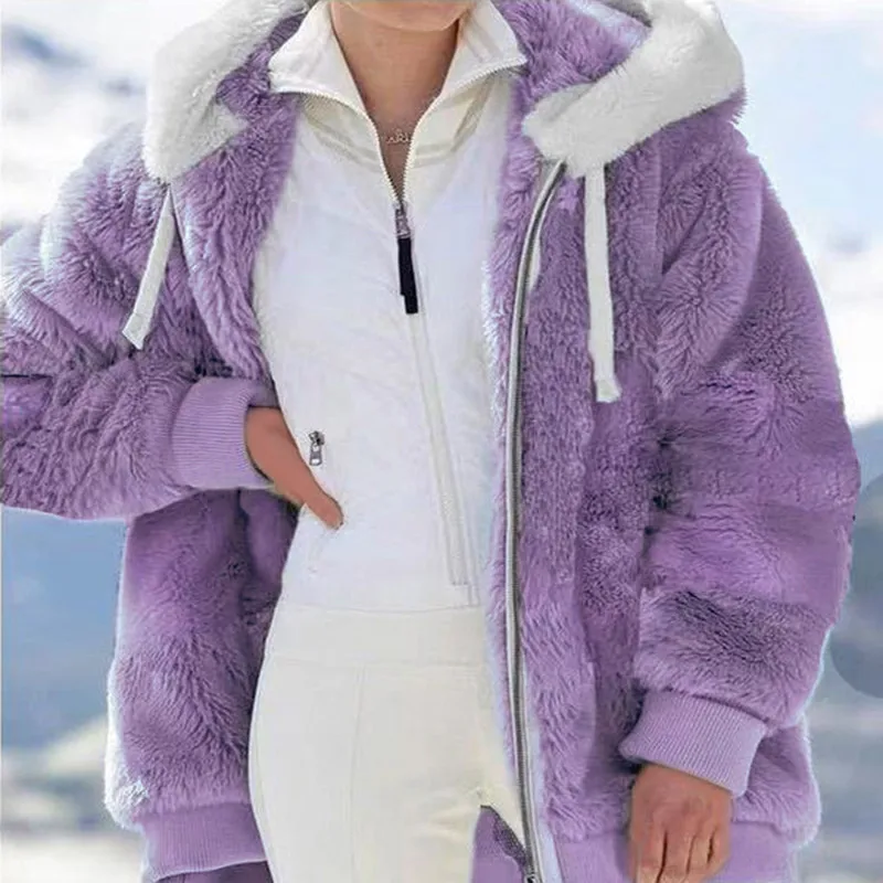Winter Women Jacket New Warm Patchwork Zipper Pocket Stitching Hooded Plaid Faux Fur Retro Long Sleeve Top Coat Outwear